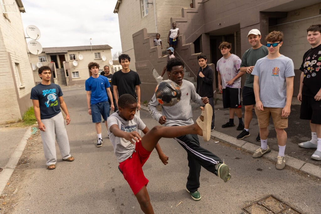 Our last day in South Africa turned out to be an unforgettable one. We took a guided tour of Langa Township to learn about the community’s history and gain a deeper understanding of daily life in one of South Africa’s oldest Black townships. A gardener working on opening a farm to table restaurant brewed us herbal tea. Some students tried “smiley”—roasted sheep’s head—which is a local delicacy. And because it was Saturday, a ton of local children were playing in the streets. So our students played pickup soccer with them and did piggyback ride races.