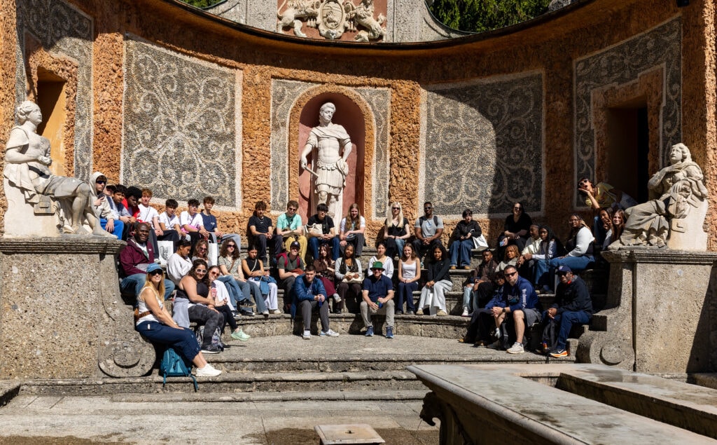 The day that followed took us to the Hellbrunn Palace trick fountains to experience its famous trick fountains. With 400-year-old engineering (no electricity—just water power) the fountains were designed to surprise and soak guests. The students had a blast, despite being a little “salty” that we didn’t warn them. (In our defense, we did tell them that there was a chance of showers!)