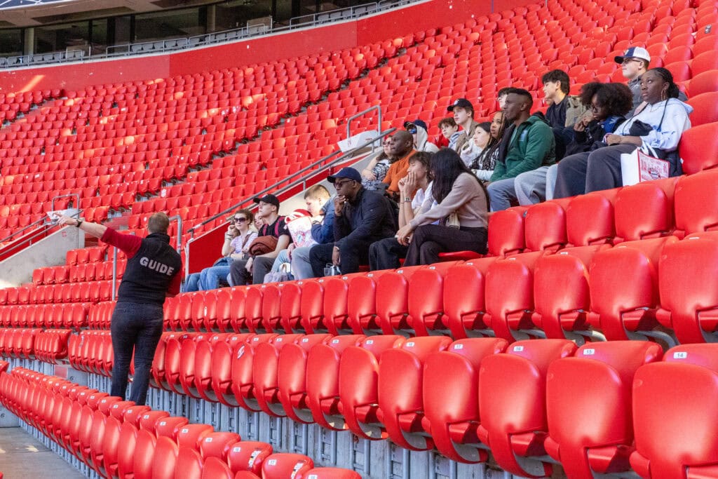 After lunch, we shifted gears for a behind-the-scenes tour of Allianz Arena, home of FC Bayern Munich. We got to walk down the player’s tunnel onto the pitch, with the Champions League anthem echoing all around us, chanting “Goal!” at the top of our lungs. (The acoustics, I can confirm, are excellent.)